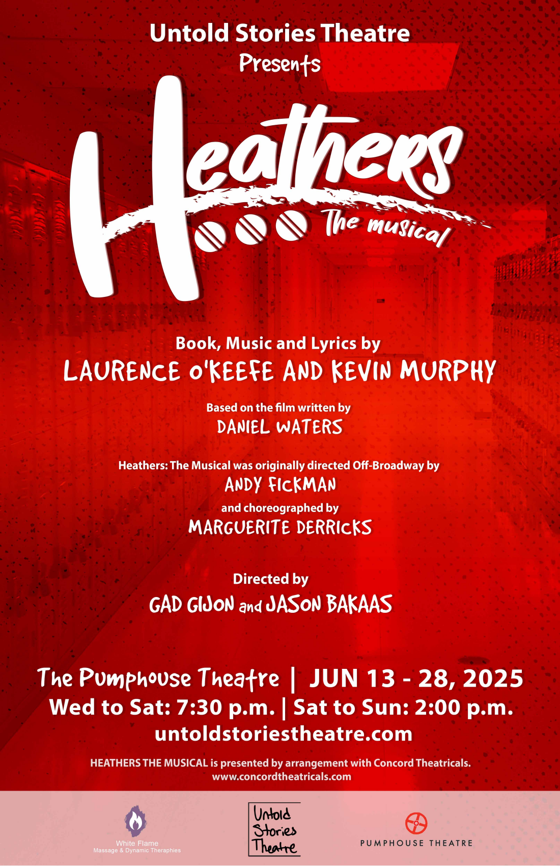 Based on the classic 1989 film. Westerberg High is ruled by a shoulder-padded, scrunchie-wearing junta: Heather, Heather and Heather, the hottest and cruelest girls in all of Ohio. But misfit Veronica Sawyer rejects their evil regime for a new boyfriend, the dark and sexy stranger J.D., who plans to put the Heathers in their place - six feet under. Brought to you by the award-winning creative team of Kevin Murphy (Reefer Madness, “Desperate Housewives”), Laurence O’Keefe (Bat Boy, Legally Blonde) and Andy Fickman (Reefer Madness, She’s the Man). Heathers The Musical is a hilarious, heartfelt, and homicidal new show based on the greatest teen comedy of all time. With its moving love story, laugh-out-loud comedy, and unflinching look at the joys and anguish of high school, Heathers will be the most popular new musical. Are you in, or are you out?